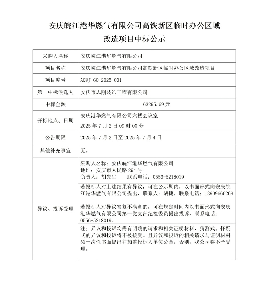 安慶皖江港華燃?xì)庥邢薰靖哞F新區(qū)臨時辦公區(qū)域改造項目中標(biāo)公示