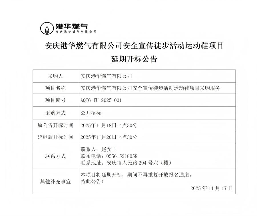 安慶港華燃氣有限公司安全宣傳徒步活動運動鞋項目延期開標公告