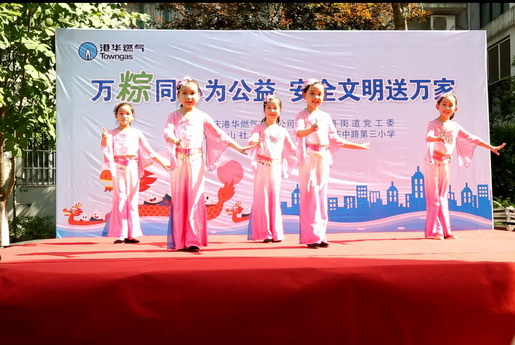 當(dāng)日,安慶港華的義工隊員和“藍(lán)焰”黨員義工們早早來到炮營山社居委轄區(qū)的諧水灣小區(qū),撐帳篷,搭展臺,搬物料,一場以“包粽子、看演出、講安全、傳文明”為主題的文化大餐陸續(xù)上演?;顒蝇F(xiàn)場熱鬧非凡,不少用戶正在港華燃?xì)獾摹傲鲃臃?wù)車”前排隊進(jìn)行燃?xì)鈭笱b和繳費(fèi),服務(wù)臺的工作人員一邊發(fā)放著燃?xì)獍踩麄魇謨?,一邊針對居民的用氣問題耐心作答。而廣場正中央搭建的演出舞臺更是吸引不少居民駐足圍觀,安慶港華燃?xì)夂蜕鐓^(qū)居民聯(lián)合打造的精彩紛呈的文藝表演正在進(jìn)行。既有優(yōu)揚(yáng)的港華企業(yè)歌曲,又有優(yōu)雅的服務(wù)禮儀表演;社區(qū)阿姨們的廣場舞,舞出了歡樂,舞出了自信,來自轄區(qū)學(xué)校孩子們有模有樣的黃梅戲表演,讓我們看到了傳統(tǒng)戲曲文化的美好傳承;穿插其間的燃?xì)獍踩R有獎問答更是引得眾人踴躍參與,掌聲、歡呼聲此起彼伏。而臺下社區(qū)阿姨和港華義工在欣賞精彩文藝演出的同時,還不忘巧手裹粽,不多會,桌上就擺滿了幾百只飄著粽葉香的愛心粽,既弘揚(yáng)了傳統(tǒng)文化,又增進(jìn)了企業(yè)和居民之間的感情,現(xiàn)場呈現(xiàn)出一片文明和諧,奮進(jìn)向上的氛圍。